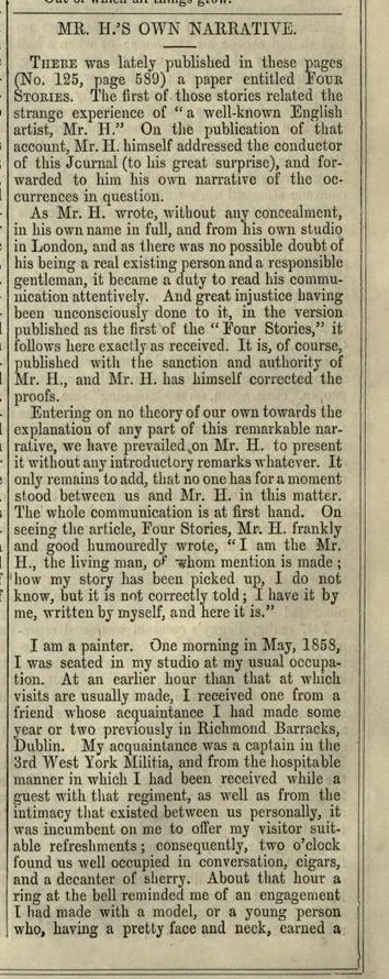 To Dickens’s surprise, artist Thomas Heaphy (the younger) wrote to All the Year Round, saying that the first story in “Four Stories” was his and he was the “Mr. H.” in question. On 5 October 1861, “Mr H’s Own Narrative” was published. Dickens also wrote the preface to this piece stating that there was “no possible doubt of [Mr. H] being a real existing person and a responsible gentleman...” but Dickens would not make any “theor[ies]...towards the explanation of any part of th[e] remarkable narrative” (36), nor did he explain in print how he came by Heaphy’s story. However dubiously (or paranormally) Dickens received Heaphy’s story, what cannot be doubted are Dickens’s editorial skills; “Four Stories” is a more cleanly presented account of a ghostly encounter. Heaphy’s narrative is constrained by unimportant details (perhaps to assert the validity of his story), but the plot is the same. There are a few more coincidental meetings (sometimes a bit too coincidental), such as Heaphy accidentally writing to the father of the dead young woman when the former was attempting to invite an old friend to dine with him. Other dubious aspects of the plot include the final ghost encounter occurring during the Christmas season (a bit too on the nose) and the father of the dead girl being stricken as “insane” and suffering from “fearful delusions” (41), which included seeing Heaphy meeting his deceased daughter in a “paroxysm” (42), until the portrait is completed. Just like the previous story, the commissioned portrait is completed by memory from the ghost encounter, but in Heaphy’s version, his artistic talent is so earth-shattering as to bring the bereaved father back from the brink of insanity. Heaphy ends his tale by narrating that he has “often seen Mr. L. [the father] since that period; his health is perfectly re-established, and his manner and conversation are as cheerful as can be expected” (42).