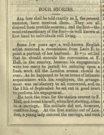 Of all the fictional ghostly encounters Dickens included in his works, there is one that may be based in reality, or at least a portion of it is. In the 14 September 1861 issue of All the Year Round, “Four Stories” was published, for which Dickens wrote in the preface: “All four shall be told exactly as I, the present narrator, have received them. They are all derived from credible sources; and the first--the most extraordinary of the four--is well known at first hand to individuals still living” (589). With this, Dickens grounds “Four Stories” as being real-life ghost stories collected, presumably, to both entertain and to assert the validity of the experience of hauntings. The first piece in the narrative describes a “well-known English artist” (Mr. H.) who was en route to paint a portrait of a society elite’s husband. While on the train to the estate, he was joined in his carriage by “very delicate looking [young woman], with a remarkable blending of sweetness and sadness” (589). The two fell into a discussion on art and portrait painting where upon the young woman asked the artist if he would be able to paint a portrait from memory. She asked him to examine her features carefully, and after the artist reluctantly replied he thought he could paint her portrait from memory, she left the carriage. Mr. H. arrived at his destination and was surprised to see that the young lady from the train was another of his host’s guests at dinner. They again fell into a pleasant conversation about portrait painting, and then all the guests retired for the night. The narrator continued by explaining how the next morning, when Mr. H. asked after the young woman, his host stated that there had been no young woman at dinner the previous night. He finished up his commission and returned to London, but “For two whole years [...] he never all the while forgot a single lineament in the fair young face of his fellow-traveller” (590). He later undertook another commission to paint a portrait of a man’s daughter who had died two years previously. The portrait would have to be completed from a description only, but no matter how the father described his daughter to Mr. H., the latter could not produce an accurate portrayal. Suddenly, Mr. H. remembered the young lady from the train, and he began to sketch her. Upon seeing the sketch, the father “exclaimed, ‘That is she!’” (590). To the avid ghost story reader, it will come as no surprise that the father related further that his daughter had died two years ago on 13 September, the very afternoon of Mr. H.’s meeting with the young woman on the train.